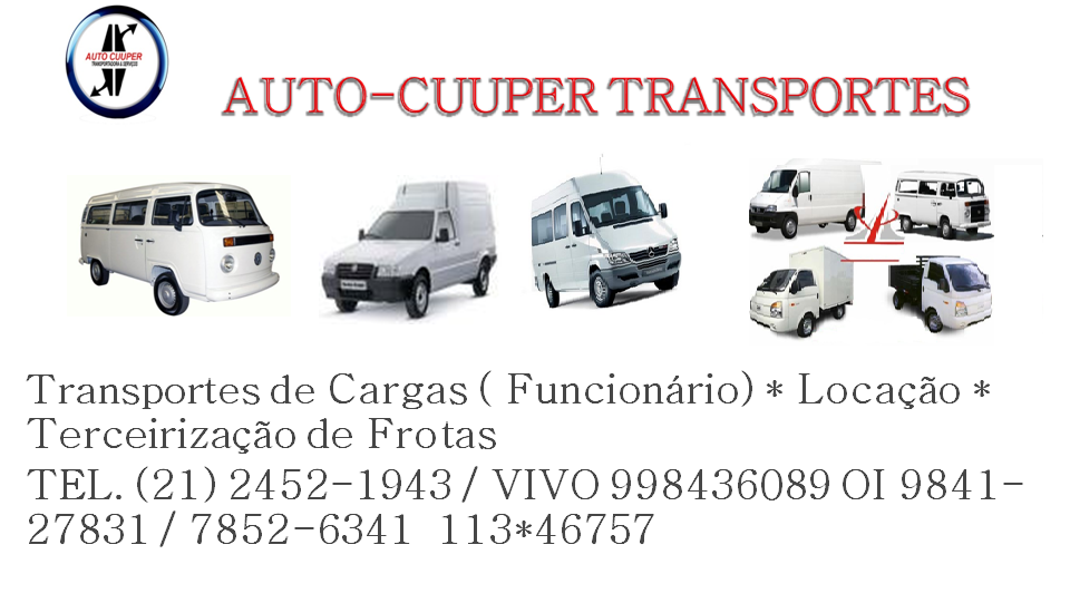 Autocuuper é uma empresa prestadora de serviços especializada em terceirização de frotas de veiculos sedan e utilitário com motorista para transportes de cargas e distribuições de mercadoria outras mais,utillizando veiculos kombi,van,doblo,fioriono,bongo entre outros medelos de veiculos não mencionada.Faça a sua cotação pelo nosso site:http://www.autocuuper.com.br