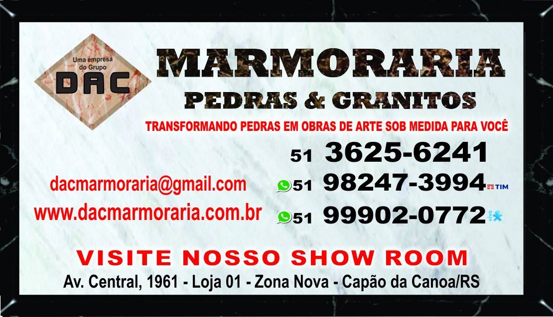 Faça seu orçamentosem compromisso… Ter QUALIDADE agregado a um ÓTIMO ATENDIMENTO, e sendo flexível nas condições de pagamento, fazem da DAC MARMORARIA… A MELHOR EMPRESA DER MÁRMORES E GRANITOS DO LITORAL NORTE DO RIO GRANDE DO SUL… Confira você mesmo