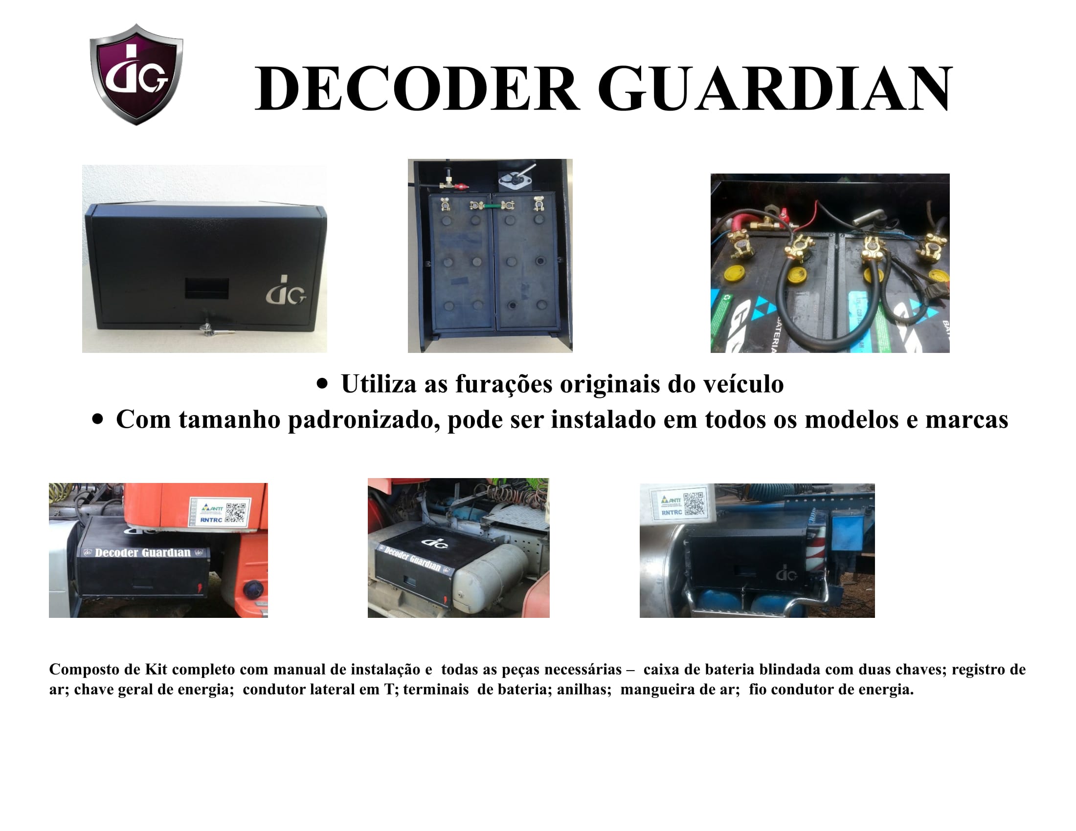 Inovador dispositivo com proteção antifurto simultâneo das baterias e veículo, protegendo a válvula de comando de alimentação do ar de freio e chave geral de ignição, acondicionados dentro de uma caixa blindada com sistema de tranca com chaves multipontos e fixada no suporte original das baterias.