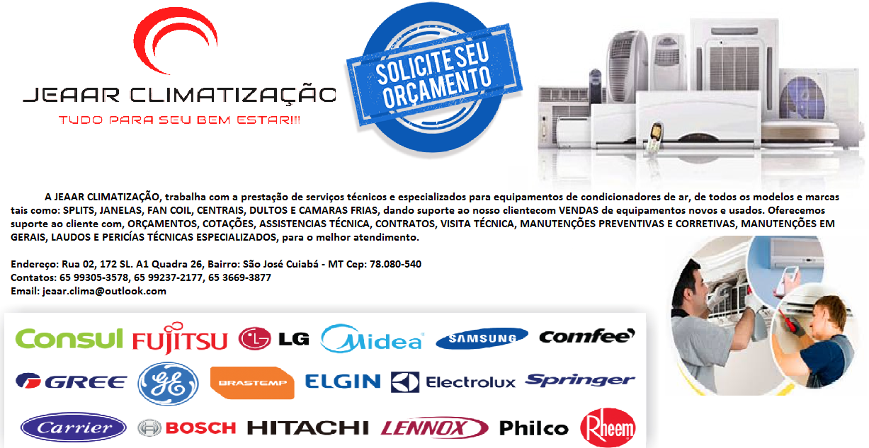 A Jeaar Climatização trabalha com a prestação de serviços especializados em equipamentos de condicionadores de ar de todos os modelos e marcas tais como: splits,cassetes, janelas, fan coil, centrais, dultos e câmeras frias; dando suporte ao nosso cliente com vendas de equipamentos novos e usados. Oferecemos o suporte ao cliente com orçamentos, cotações, assistência técnica, contratos, visita técnica, manutenção preventiva e corretiva, manutenção em gerais, laudos e pericias técnicas para melhor lhe atender!!!