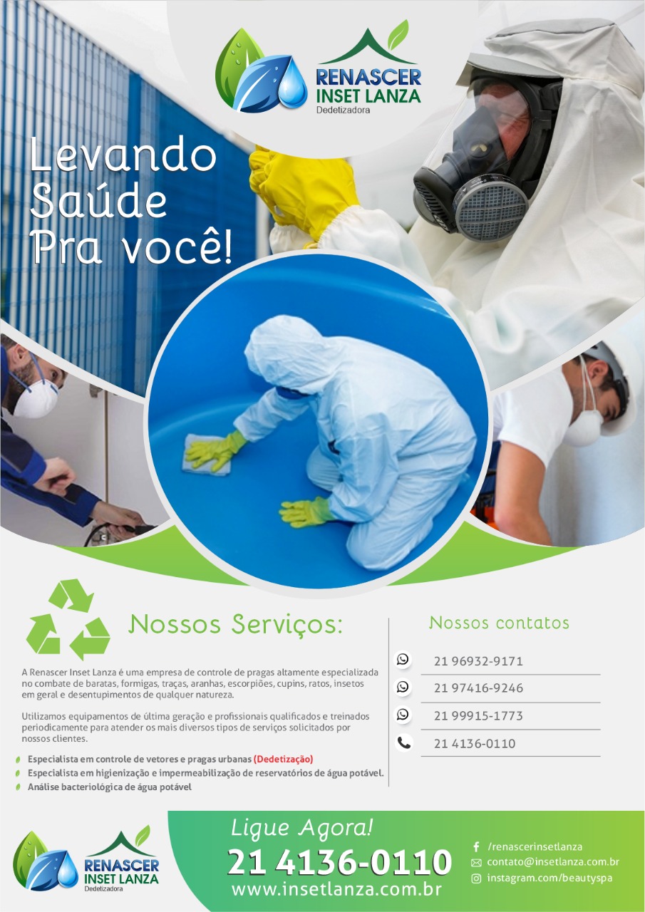 Somos a Inset Lanza trabalhamos com limpeza de caixa d´ água e dedetização , tem profissionais altamente treinados, responsáveis e equipados devidamente para o serviço, somos licenciados e trabalhamos conforme a lei. Nosso lema é: Só é bom para a gente se for bom para o cliente. Caso queira um orçamento ou agendar uma visita sem compromisso ligue para: (21) 99915-1773 ou mande um e-mail para: [email protected] .