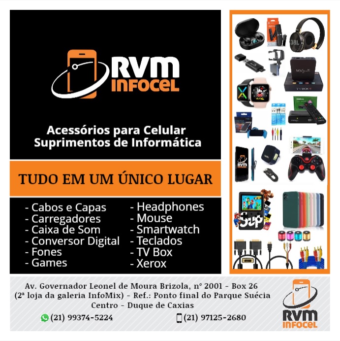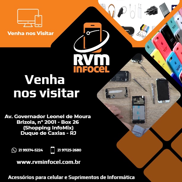 RVM Infocel vende: Capas de Celular, caixa de som, fone e headphone (Bluetooth, com e sem fio, gamer), som a pilha, cabos USB para seu celular e computador, cabos para computador, Cabos para sua tv ou caixa de som, carregadores (de parede, portatil, veicular, kit 3 em 1), mini game, headphone gamer, teclado e mouse gamer, smartwatch, tv box, camera, webcam, tomada, pilha, xerox, impressão, barbeador, kit ferramenta para manutenção de computador, ring Light, suporte para celular para carro e moto entre outros itens.